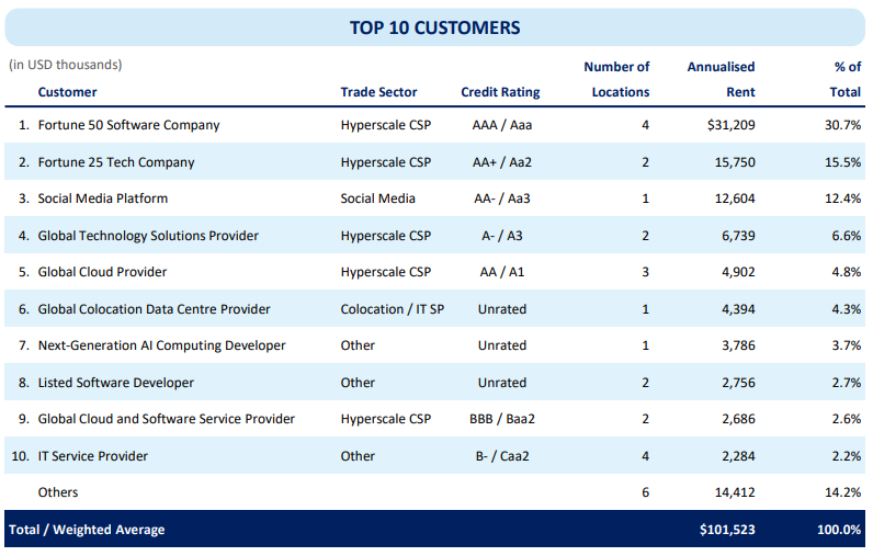 Digital Core REIT has a stable and resilient portfolio with more than 120 customers as at 30 September 2025. The top customers in the portfolio consist of leading global cloud providers, global colocation and interconnection provider, social media platform and IT solutions providers. In terms of credit quality, 79% of annualised rent was contributed by investment grade customer as at 30 September 2025.