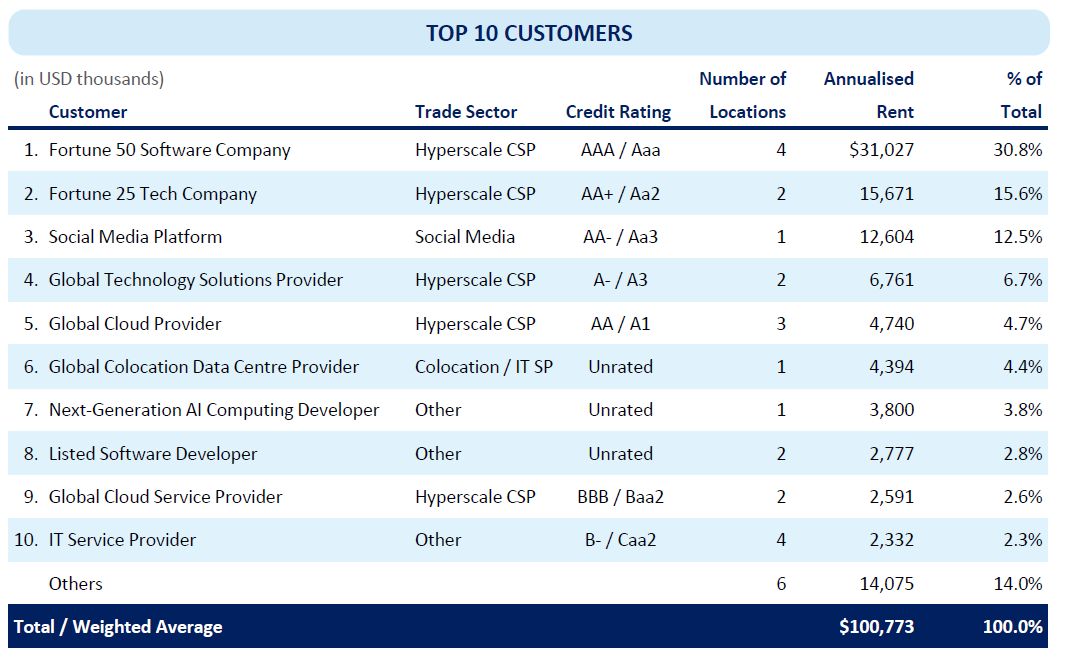 Digital Core REIT has a stable and resilient portfolio with more than 120 customers as at 31 December 2025. The top customers in the portfolio consist of leading global cloud providers, global colocation and interconnection provider, social media platform and IT solutions providers. In terms of credit quality, 79% of annualised rent was contributed by investment grade customer as at 31 December 2025.